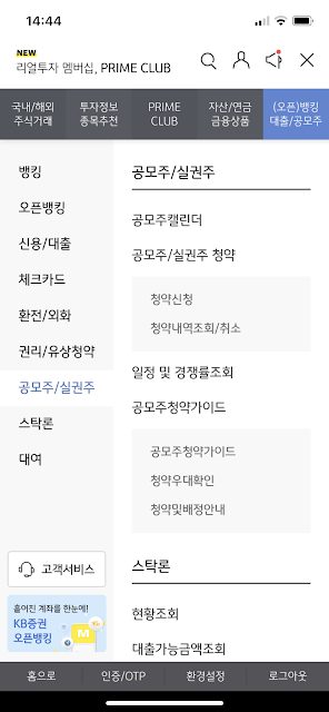 앱에서 공모주 주식청약 메뉴 위치 KB증권 경우. 주식청약은 구매가 뱅킹 쪽에 있습니다.오늘은 KB증권의 경우를 예로 들었는데요,삼성증권, 한국투자증권 모두 뱅킹쪽에 가면 청약 가능한 메뉴가 있습니다.기억할것은, "청약은 뱅킹 메뉴에 있다."카카오뱅크 청약이 가능한 KB증권의 경우에도 뱅킹쪽에 가면 확인할 수 있습니다.처음 로그인하면, 주식 거래 메뉴에 들어오는데, 여기서 헤매지마시고,오픈 "뱅킹" 대출/공모주 라고 써있는 메뉴에 갑니다.좌측에 보시면, 권리/유상청약 이라는 메뉴가 보입니다.우측에 청약신청이라는 메뉴 보이시죠?거기에 들어가서 청약을 신청하시면 됩니다.다시 한번, 기억해야할 것은, 청약은 뱅킹 메뉴쪽에 있다. 이메일로 전송BlogThis!X에 공유Facebook에서 공유